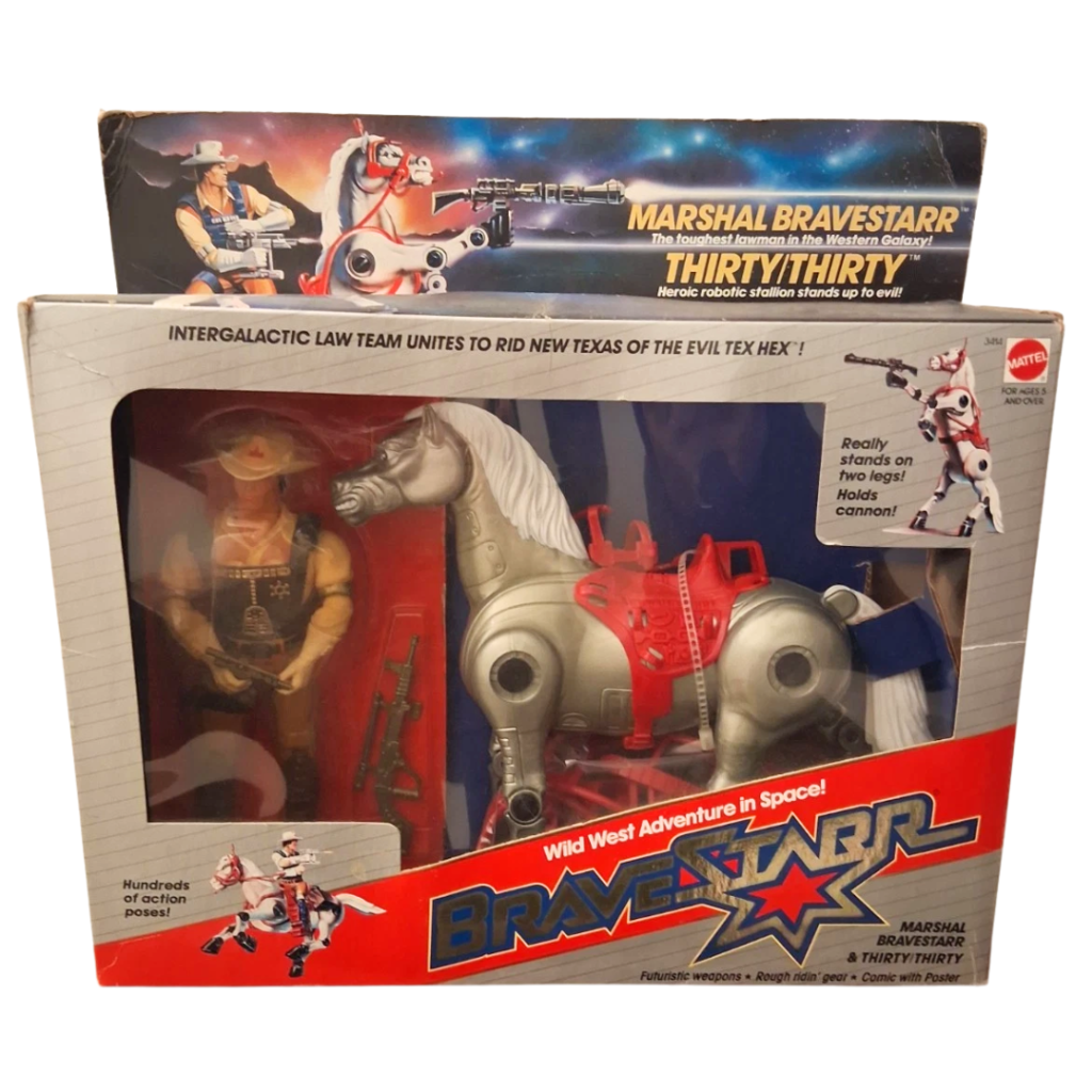 In 1986 Mattel released the toy series Bravestarr. The toys were released a year before the cartoon by Filmation launched. The cartoon ran for one series and had 65 episodes. The Bravestarr movie was released in 1988. The toys were eight inches tall and looked quite different to the other, smaller figures that were being produced by lots of other toy companies.